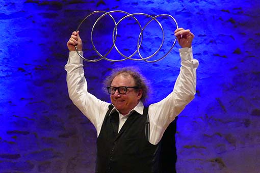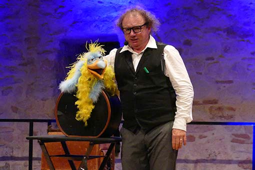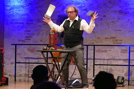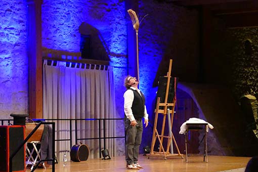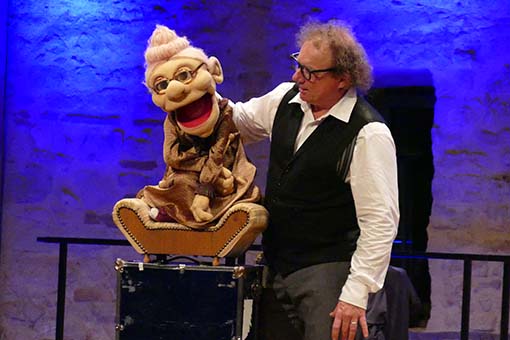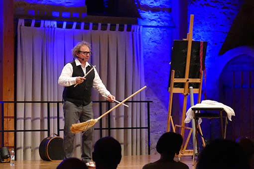Als Alleinunterhalter, der sein Publikum 90 Minuten auf Trab halten will, muss man sich schon einiges einfallen lassen! Karl-Heinz Dünnbier ist das hervorragend gelungen. Von Anfang an wurde das Publikum mit eingebunden: zum Aufpassen auf verknotetete und unverknotetete Gespenstertücher im Weinglas, zum Spenden eines verschwindenden Geldscheins, der unversehrt und ungespritzt aus einer demeter-Zitrone wieder auftauchte oder zum Bewahren eines Holzrahmens, der in nicht nachvollziehbarer Weise wieder um sein ursprüngliches Bauklötzchenbild passte, obwohl es in der Zwischenzeit doch um mehrere Klötze angewachsen war. Vielfalt äußerte sich im akrobatischen Körpereinsatz, staunenswerten Zaubertricks, Bauchrednerei und -gesang mit drei verschiedenen Figuren, die entweder aus einem Koffer gezaubert wurden oder sich aus einem einfachen Tuch in einen süßen Hasen verwandelten. Natürlich war alles auf schwäbisch und somit für norddeutsche Besucher auch aufgrund der schnellen Artikulation denkbar ungeeignet. Aber unser Zehntscheuerpublikum schien – allein von den vielen Lacheffekten her – ziemlich gut damit zurechtzukommen. Jedenfalls: Karl-Heinz Dünnbier sollte man sich merken, denn er „hot von ellem ebbes uffm Kaschda!“